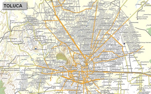El mapa del estado de ESTADO DE MÉXICO incluye la ciudad de Toluca con calles y avenidas con nombre, mismas que usted pordrá buscar en su gps ingresando datos como: estado, ciudad, calle ó cruce de calles.