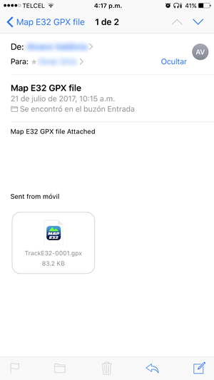You can import GPX files that contain tracks and/or waypoints, from emails or other apps. Map E32 will import all the tracks and waypoints it contains. Track manager and Waypoint manager will save this info.