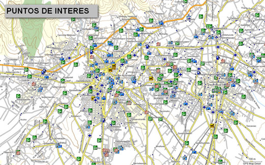 Railroad tracks- Cities - Towns - Neighborhoods - Ranches - Airports - Contour lines every 30 mts - Hill names- Points of interes t- Rivers -